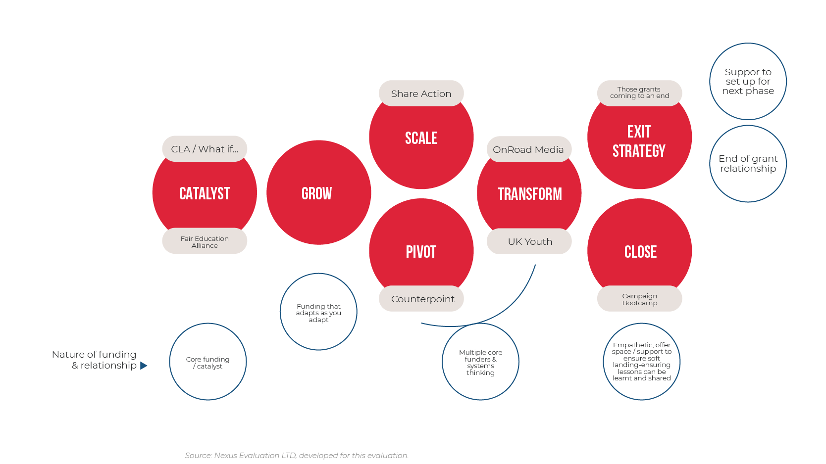 The below figure visualises the key life stages of an organisation with types of funding and support. Notice the focus on the relational aspects of the support provided.